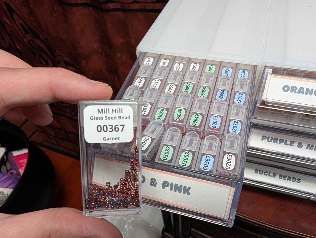I then printed Mill Hill labels for them, which I do sell on my Etsy store. I color coded mine, so white is glass, green is antique, blue is frosted, and any purple ones are petite. Makes it real easy to find what I’m looking for at a glance!